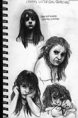I thought I'd post the sketches I have scanned in/photographed so far for the Oddities piece - which I have named "The Terrible Two"... a portrait of some evil little girl siamese twins ;)